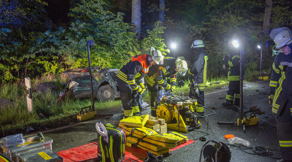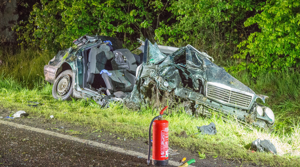 Am Abend des 1. Mai ereignete sich ein schwerer Verkehrsunfall auf der B49. Entgegen der Erstmeldung handelte es sich um einen Alleinunfall. Ein Motorrad, wie zunächst von Ersthelfern mitgeteilt, war nicht beteiligt. Ersten Ermittlungen zufolge fuhr ein mit zwei Personen besetzter Pkw die B49 von Ruppertenrod kommend in Richtung Flensungen. Bei geradem Fahrbahnverlauf verlor der 22-jährige, aus einer Vogelsberger Gemeinde stammende, Führer des Pkw die Kontrolle über das Fahrzeug und kam nach rechts von der Fahrbahn ab. Hier durchfuhr er den Flutgraben und prallte seitlich gegen einen Baum. Der Pkw wurde erheblich beschädigt und deformiert. Der 21-jährige Beifahrer wurde im Fahrzeug eingeklemmt und konnte durch den Einsatz von hydraulischem Gerät durch die Feuerwehr aus dem Fahrzeugwrack befreit werden. Beide Insassen wurden schwer verletzt und in Kliniken eingeliefert, wobei der schwerverletzte Beifahrer durch einen Rettungshubschrauber in die Klinik geflogen wurde. Der Pkw Führer war offensichtlich nicht fahrtüchtig und stand unter Alkohol- und/oder Drogeneinfluss, eine Blutentnahme wurde durchgeführt, weiterhin war er nicht im Besitz einer Fahrerlaubnis. Am Pkw entstand Sachschaden von etwa 3.500 Euro. Durch den Aufprall wurde ein Motorradhelm aus dem Fahrzeug auf die Fahrbahn geschleudert, sodass bei den Ersthelfern die Annahme entstand, ein Krad sei am Unfall beteiligt gewesen. +++
