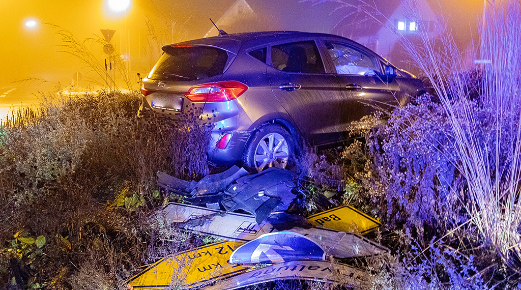Am Fahrzeug entstand ein wirtschaftlicher Totalschaden, und es musste abgeschleppt werden. Auf dem Kreisel herrschte ein Bild der Verwüstung. Mehrere Verkehrs- und Hinweisschilder waren völlig zerstört. Wegen des Verdachts auf Alkoholgenuss wurde eine Blutentnahme angeordnet. Die Freiwillige Feuerwehr Lauterbach, Löschzug Mitte, leuchtete die Unfallstelle aus, sicherte sie ab und beseitigte ausgelaufene Betriebsstoffe. Zehn Einsatzkräfte der Feuerwehr, der Rettungsdienst und eine Streife der Lauterbacher Polizei waren vor Ort. +++