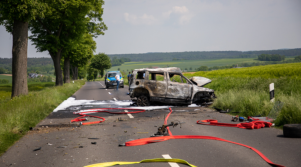 Tödlicher Unfall am Montagmittag auf der L3156 bei Alsfeld im Vogelsbergkreis; Ein 66-Jähriger Mann aus Alsfeld fuhr mit seinem Skoda die Landstraße von Alsfeld kommend in Richtung Münch-Leusel, als er aus bislang unbekannter Ursache von der Fahrbahn abkam und frontal mit einem am Fahrbahnrand befindlichen Baum kollidierte und in Flammen aufging. Der Fahrer wurde Vermutlich durch die Wucht des Aufpralls wurde der Mann aus dem Pkw geschleudert und tödlich verletzt. Zahlreiche Einsatzkräfte rückten an; die Feuerwehr löschte das brennende Wrack ab. In diesem Zusammenhang sowie im Rahmen der Bergungsarbeiten, war die Landstraße im Bereich der Unfallstelle für rund dreieinhalb Stunden voll gesperrt. +++