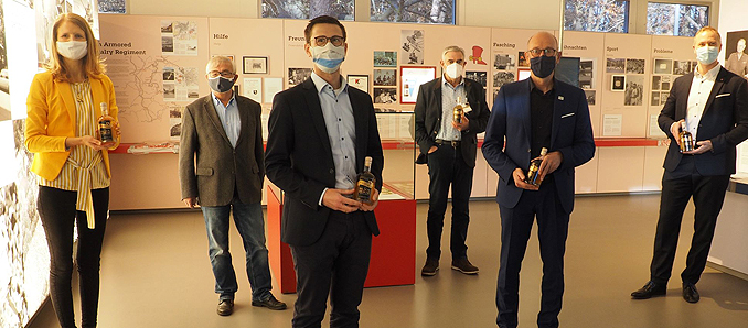 „The Black Horse“ wird passend in der Ausstellung „Everyday Life“ im US-Camp der Gedenkstätte präsentiert von Manuela Henkel (Bürgermeisterin Geisa), Berthold Jost (Ehrenamtlicher Vorstand Point Alpha Stiftung), Sebastian Leitsch (Geschäftsführer Point Alpha Stiftung), Matthias Weller (GenussKultur e.V.), Jürgen Hahn (Bürgermeister Rasdorf), Tobias Wiedelbach (Geschäftsführer Schlitzer Destillerie) - Foto: Point Alpha Stiftung