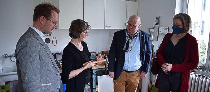 Süßwasserperlen, Weiß- und Gelbgold, Hämmer, Feilen, Punzen, Vogelsberger Basalt, Flusssäurebäder, Gießformen aus Sepiaschalen (einem Teil des Tintenfisch-Skeletts), Bergkristalle, Amethysten, Grüner Granat, Ziselierungen, Gravuren und Intarsien – wenn Goldschmiedemeisterin Ingrid Wriedt beginnt, von ihrer Kunst und ihrem Handwerk zu erzählen, bleibt dem Laien meist nur die Rolle des gebannt lauschenden Zuhörers. Denn in ihrem Atelier „WerkArt“ in Alsfeld, das Werkstatt und Verkaufsraum vereint, schildert die Vogelsberg ORIGINAL-Künstlerin eindrucksvoll, worauf es ihr bei ihrer Arbeit ankommt. Die geneigten Zuhörer: Dr. Jens Mischak, Erster Kreisbeigeordneter, Stephan Paule, Bürgermeister der Stadt Alsfeld, und Andrea Ortstadt von der Wirtschaftsförderung des Vogelsbergkreises, die Ingrid Wriedt in ihrem Atelier für Schmuckgestaltung besuchten. „Etwas ganz Besonderes – nicht nur das Handwerk in der Goldschmiede erleben zu dürfen, sondern dieses auch als Vogelsberg ORIGINAL präsentieren zu dürfen“, kommentiert Dr. Jens Mischak, Erster Kreisbeigeordneter, den Besuch.