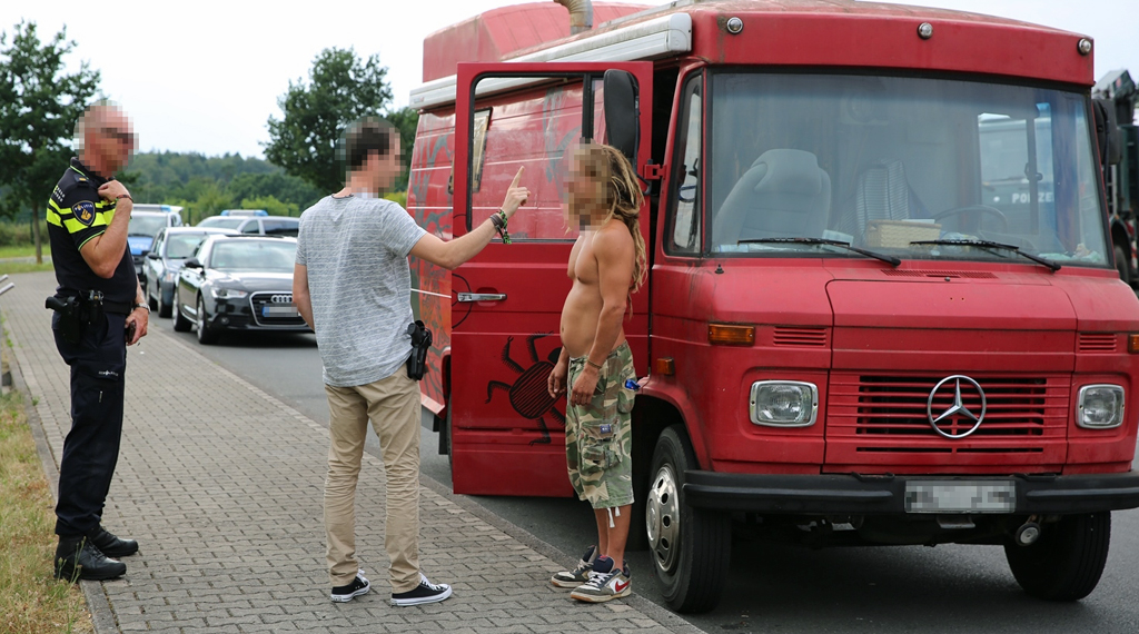 Ein reisender Festivalbesucher aus Schweden wird von Polizisten auf Drogen überprüftEinen besonderen Fall erlebten die Polizisten bei einer Kontrolle am Parkplatz Berfa. Dort trafen sie einen 34-jährigen Autofahrer an, der Marihuana konsumiert und 2,4 Gramm der Droge mit sich führte. Sein 35-jähriger Beifahrer besaß laut Polizeiangaben einen lettischen Führerschein in Form einer Totalfälschung. Zu allem Überfluss waren die Zulassungsbescheinigung des Autos gefälscht und eine falsche Prüfplakette angebracht. „Wir ermitteln in diesem Fall wegen sechs Tatbeständen“, teilte die Polizei mit. In einem weiteren Fall stellten die Beamten die illegale Einreise eines 32-jährigen Mannes aus der Ukraine fest, er legte manipulierte Papiere vor. Auch einen Verstoß gegen das Waffengesetz wurde von den Einsatzkräften geahndet, so fanden sie in einem Auto ein sogenanntes Einhandmesser vor.