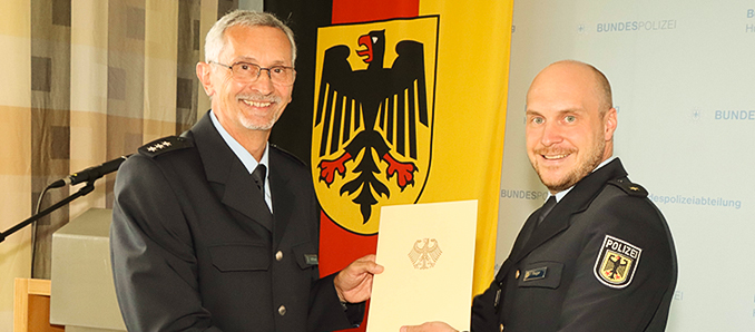Am 31. August verabschiedete der stellvertretende Abteilungsführer, Polizeirat Steffen Rieger, Polizeihauptkommissar Uwe Hoffmann nach mehr als 44 Dienstjahren in den wohlverdienten Ruhestand. Nach einer Ausbildung zum Mechaniker trat der heute 62-Jährige 1979 in Fuldatal in den damaligen Bundesgrenzschutz ein. Schon 1981 verschlug es den gebürtigen Saarländer in die heutige Bundespolizeiabteilung Hünfeld, wo er zuletzt als Polizeitrainer und Leiter des Polizeitrainingszentrums tätig war. Der lizensierte Ju-Jutsu-Trainer und -Prüfer ist zudem auch Fitnesstrainer des Deutschen Turner-Bundes sowie Fachübungsleiter Handball. Steffen Rieger betonte in seiner Rede die vielfältigen Verwendungen, die Uwe Hoffmann im Laufe seiner Karriere durchlief. Im Beisein von Ehefrau Regina sowie seiner beiden Töchter Tanja und Lisa nahm der in Hünfeld lebende Pensionär die Ruhestandsurkunde entgegen. +++