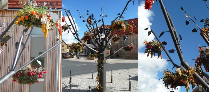Poppenhausen. Zur Ernte-Dank-Zeit zeigen sich die Rhöner jedes Jahr aufs Neue besonders Kreativ. Es ist eine lange und schöne Tradition, die nach der Erntezeit gepflegt wird. Ob Ernte-Dank-Brunnen, Früchteteppich, Hauseingänge oder Altarräume in den Kirchen und Kapellen – das Thema lässt sich vielfältig darstellen. Die Ortsmitte von Poppenhausen wurde vor einigen Jahren um den sog. „Lebensthemenbaum“ bereichert. Diese sinnhafte Metallskulptur dient u.a. speziell dazu, zu verschiedenen Anlässen und Themen gestaltet, geschmückt bzw. dekoriert zu werden.