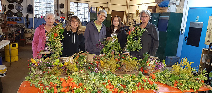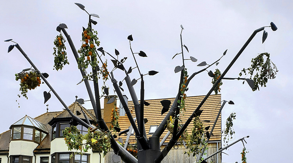 Als besonders kreative Köpfe zeigten sich auch in diesem Jahr wieder die Poppenhausener Landfrauen, so Bürgermeister Helfrich. Sie schmückten die Skulptur, indem sie Drahtkörbe mit verschiedenen Früchten füllten und belegten, die anschließend an den „Baum“ gehängt wurden. Der dekorierte Lebensthemenbaum schmückt jetzt einige Wochen um das Ernte-Dank-Fest die Ortsmitte zur Freude der Einheimischen und der Gäste. Schließlich passen die Themen Landwirtschaft, Landfrauen und Ernte-Dank gut zusammen, meint Bürgermeister Manfred Helfrich, der sich auch in diesem Jahr wieder über die Unterstützung der Landfrauen freute.