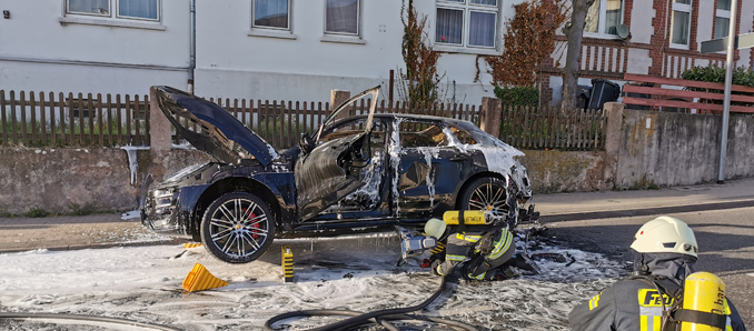 Am Freitagabend brannte gegen 18 Uhr in der Meisebacher Straße in Bad Hersfeld ein Porsche Macan völlig aus. Der Fahrer bemerkte beim Verlassen des Kreisverkehrs am Anfang der Meisebacher Straße Feuer im hinteren Teil seines Fahrzeugs. Der Mann konnte das Fahrzeug gerade noch rechtzeitig und unverletzt verlassen, bevor es auch schon im Vollbrand stand. Von der Feuerwehr aus Bad Hersfeld, die mit 8 Einsatzkräften schnell an der Einsatzstelle eintraf, konnte das Feuer zwar unter Einsatz von Löschschaum schnell gelöscht, ein Totalschaden des Porsches aber nicht mehr verhindert werden. Wie die Polizei mitteilte, hat der Fahrer vermutlich im Kofferraum einen Chafing-Disch mit brennender Brennpaste in der Brennschale transportiert. Die Höhe des Sachschadens wird von der Polizei mit ca. 50.000 Euro beziffert. Während der Löscharbeiten musste die Meisebacher Straße an der Einsatzstelle voll gesperrt werden. +++ yk