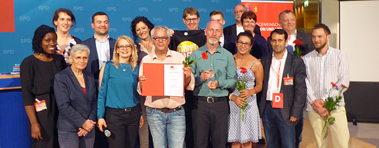 Fulda. Am vergangenen Freitag, 9.Juni, wurde der Verein Bündnis Fulda-stellt-sich-quer vom Arbeitskreis Migration & Vielfalt der SPD Bundespartei nach Berlin in das Willy-Brandt-Haus eingeladen. So nahmen am Abend bei einem gelungenen Sommerempfang der Vorstand Andreas Goerke, Rolf Müller Kassierer Martin Übelacker und Schriftführer Volker Oertel mit sechs weiteren aktiven Mitgliedern (Silvia und Martin Oudhoff, Monika Sommer, Lothar Waschke und Lukas Goerke) UB-Vorsitzenden und Landtagsabgeordneten Sabine Waschke, die ebenfalls Mitglied bei Fulda-stellt- sich quer ist, den Preis für Vielfalt 2017 entgegen.