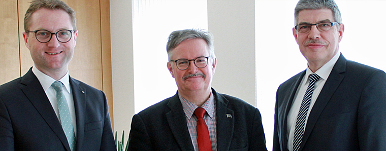 Landrat Manfred Görig (rechts) und Erster Kreisbeigeordneter Dr. Jens Mischak (links) gratulieren dem Kreis-Pressesprecher Erich Ruhl-Bady zum 25-jährigen Dienstjubiläum. Foto: Gaby Richter