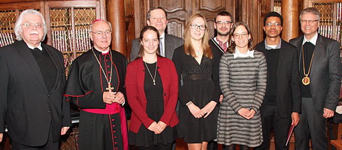 Zu Beginn der Festakademie hatte Rektor Prof. Dr. Christoph Gregor Müller den Bischof sowie Weihbischof Prof. Dr. Karlheinz Diez, die Domkapitulare und Professoren der Theologischen Fakultät und zahlreiche Gäste aus Gesellschaft, Kirche und Wissenschaft begrüßt. Im Laufe der Veranstaltung wurde der Referent, Hochschuldozent Dr. Klaus Dorn (Marburg), für 35 Jahre Lehrtätigkeit mit einer Festschrift geehrt und in den Ruhestand verabschiedet. Der Rektor dankte des Weiteren Offizialatsrat Eric Janson und Studienrätin Dr. Andrea Paul für ihr langjähriges Wirken am Katholisch-Theologischen Seminar der Universität Marburg. Sodann sprach er dem scheidenden Justitiar des Bistums, Dr. Albert Post, und Domkapitular Professor Dr. Lothar Wächter seinen Dank für ihre Lehrtätigkeit an der Theologischen Fakultät aus. Ihre Promotionsurkunden erhielten Justin Kamwanya Kishimbe aus dem Kongo und Nazariy Mysyakovskyy aus der Ukraine. Für ihre akademischen Abschlussarbeiten wurden den angehenden Pastoralreferentinnen Sarah Benkner, Katharina Kraus und Victoria Angelstein der mit je 1.000 dotierte Eduard-Schick-Preis verliehen. Die Akademieveranstaltung wurde von Marius Hübner, Dominik Ritter und Raphael Weichbrodt mit hebräischen Liedern und Musikstücken umrahmt.