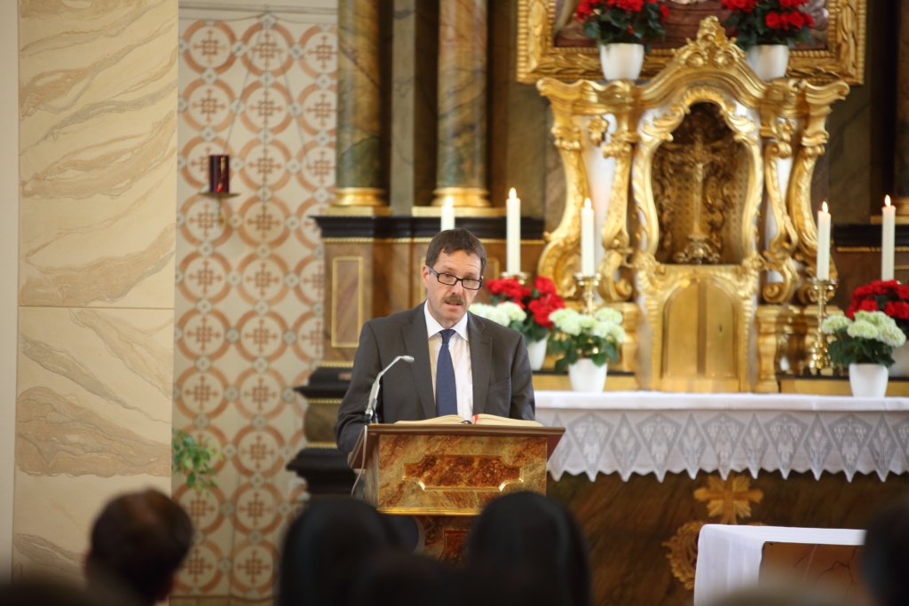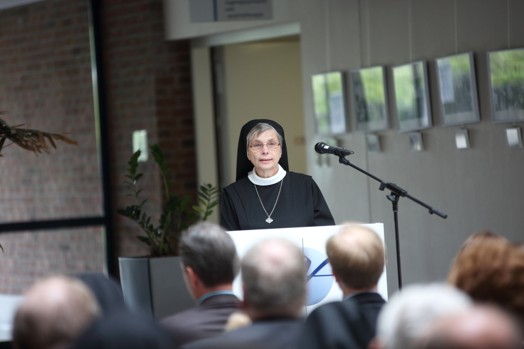 „Sehr geehrter Herr Prof. Kronenberger, sie haben sich ihrer neuen Aufgabe und Herausforderung als neuer Chefarzt der Abteilung ‚Allgemeine Innere Medizin, Gastroenterologie, Hepatologie und Diabetologie‘ mit viel Verantwortung gestellt und sich mit hoher Fach- und Sachkompetenz - ihrer Position angenommen. Den Patienten begegnen sie stets mit Würde und Respekt, schenken ihnen Hoffnung und Zuversicht. Für sie, steht ganz und gar der Mensch im Mittelpunkt. Ich wünsche ihnen in ihrem neuen Amt alles erdenklich Gute sowie Gottes reichen Segen“, so Generaloberin Schwester Birgit Bohn in ihren Begrüßungsworten.