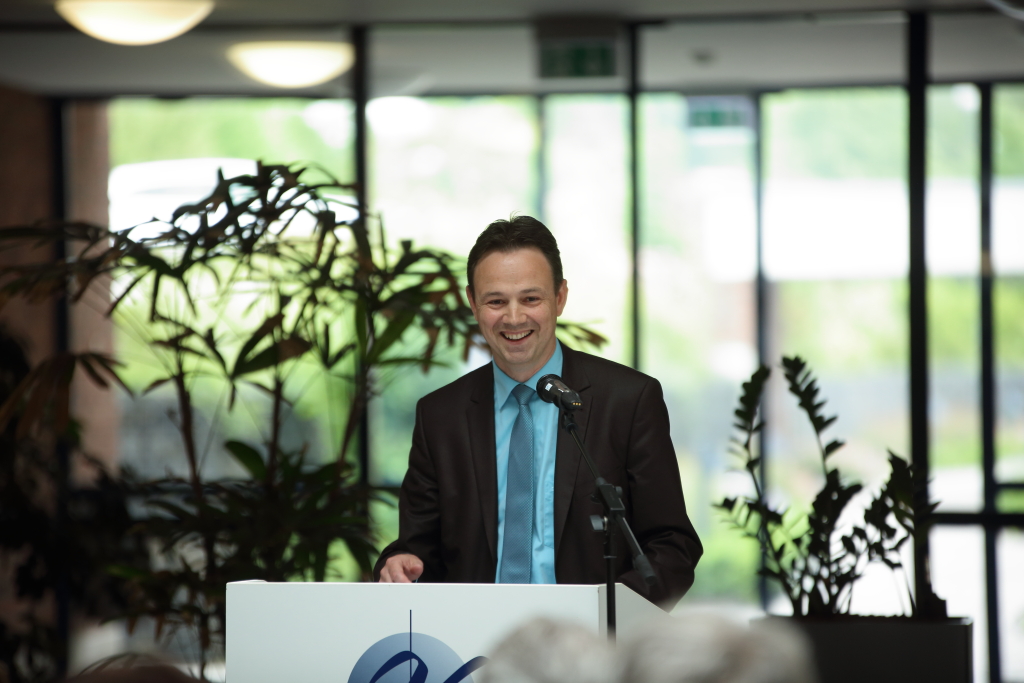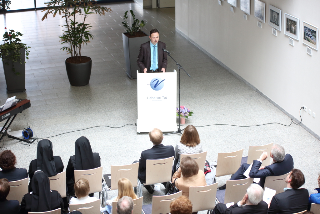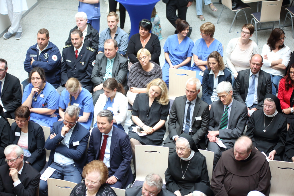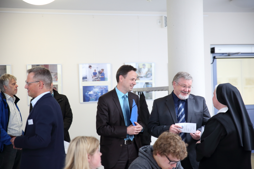 Prof. Dr. Bernd Kronenberger, der bereits seit sechs Monaten am Herz-Jesu-Krankenhaus Fulda in seiner Position als Chefarzt der oben genannten Abteilung praktiziert, kann, wie er in seinen Grußworten mitteilte, auf eine positive Zeit zurückschauen. Das Herz-Jesu-Krankenhaus sei etwas besonders in der Region und wohl doch - sehr viel mehr, als nur ein Krankenhaus der Grundversorgung. Vor allem beeindrucke ihn das Leitbild des christlich geprägten Hauses, „Liebe sei Tat“, nach diesem man am Herz-Jesu-Krankenhaus Fulda - beständig handle und praktiziere. Daneben sei das Haus mit seinen Mitarbeiterinnen und Mitarbeitern sowie der ärztlichen Versorgung, gut aufgestellt. So habe das Herz-Jesu-Krankenhaus, wenn auch noch nicht alles möglich ist, hervorragende Ärzte in den Abteilungen. Um den medizinischen Standard in der Region sicherzustellen, bräuchte man nach Kronenberger - zuverlässige Kooperationspartner und dachte diesbezüglich an das Klinikum Fulda, dieses mit dem Herz-Jesu-Krankenhaus in vielen medizinischen Zentren kooperiere. Abschließend dankte Prof. Dr. Kronenberger den Rednern, diese in seiner Gesamtheit, für ihn eine große Ehre gewesen seien. Ausschlaggebend für ihn - ans Herz-Jesu-Krankenhaus Fulda gekommen zu sein, war u. a. die ‚gelebte Liebe zum Menschen‘.