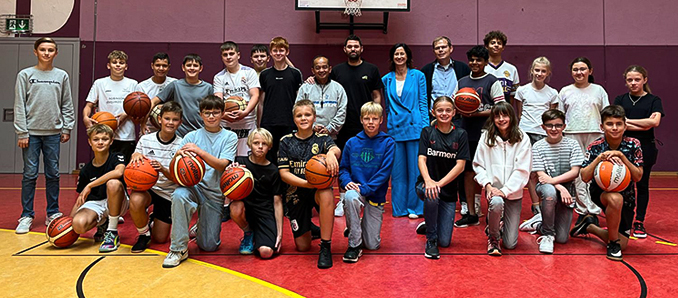 13 AG-Schüler durften dem Profitrainer Fragen stellen und natürlich stand ein gemeinsames Training auf dem Programm. Auch im Unterricht von Sportlehrer David Siegert, die in der Halle nebenan gerade Basketball spielte, schaute Sebastian Gleim vorbei. „Das war echt unerwartet und beeindruckend“, fand der Neuntklässler Eduard Gaspar, der sich die Trainingseinheit mit dem Profi für den Basketball-Workshop bei den Hessischen Gesundheitsspielen abgeschaut hat. „Die Übung, die er uns gezeigt hat, vermittelte das Gefühl für den Ball. Das ist für Anfänger genau das Richtige“, fand er und sagt außerdem: „Ich finde es klasse, dass sich Sebastian Gleim weiterhin für die TV Hersfeld Titans einsetzt“. +++