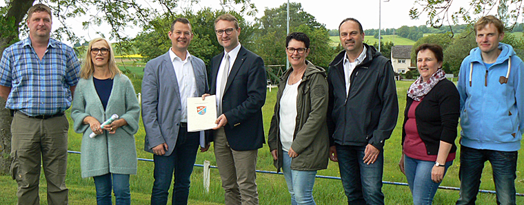 Erster Kreisbeigeordneter Dr. Jens Mischak (Vierter von links) überreicht an Bürgermeister Timo Georg (Dritter von links) einen Förderbescheid für den Mehrgenerationen-Platz. Foto: Sabine Galle-Schäfer