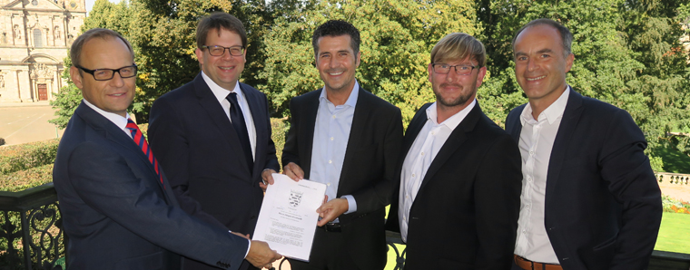Beim Beurkundungstermin: Bürgermeister Dag Wehner, Oberbürgermeister Dr. Heiko Wingenfeld, Matthias Stanke, Thomas Theiler und Christian Heil. (v.l.)