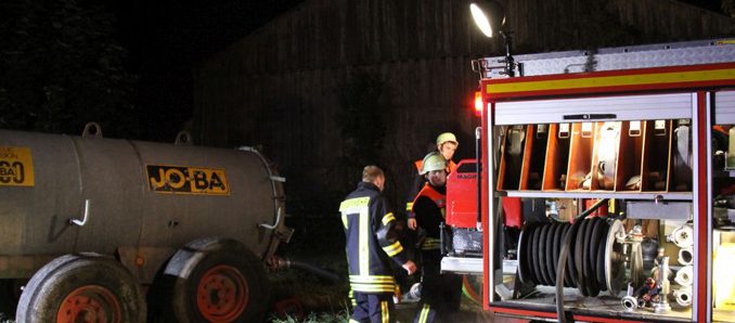 Der Brand eines Stallgebäudes in Weyhers in der Gemeinde Ebersburg beschäftigte die Feuerwehr in der Nacht zu Sonntag. Der etwa 40 x 15 Meter große Anbau einer Stallanlage war in Flammen aufgegangen, nachdem ein Radlader in Brand geraten war. Zum Glück gelang es dem Landwirt noch, die darin befindlichen Rinder in den benachbarten Großstall zu treiben. Die Feuerwehr konnte den Brand schnell unter Kontrolle bringen, obwohl auf dem Hof nur drei Löschwasser Zisternen vorhanden waren. Als Reserve verlegten die Brandschützer über mehrere hundert Meter eine Schlauchleitung bis ins Dorf, um ausreichend Wasser zur Verfügung zu haben. So gelang es auch, das hinter dem Stall liegende Strohlager zu schützen. Die Nachlöscharbeiten werden sich wohl aber noch bis in den Tag hinein hinziehen. Verletzt wurde bei dem Brand glücklicherweise niemand. +++