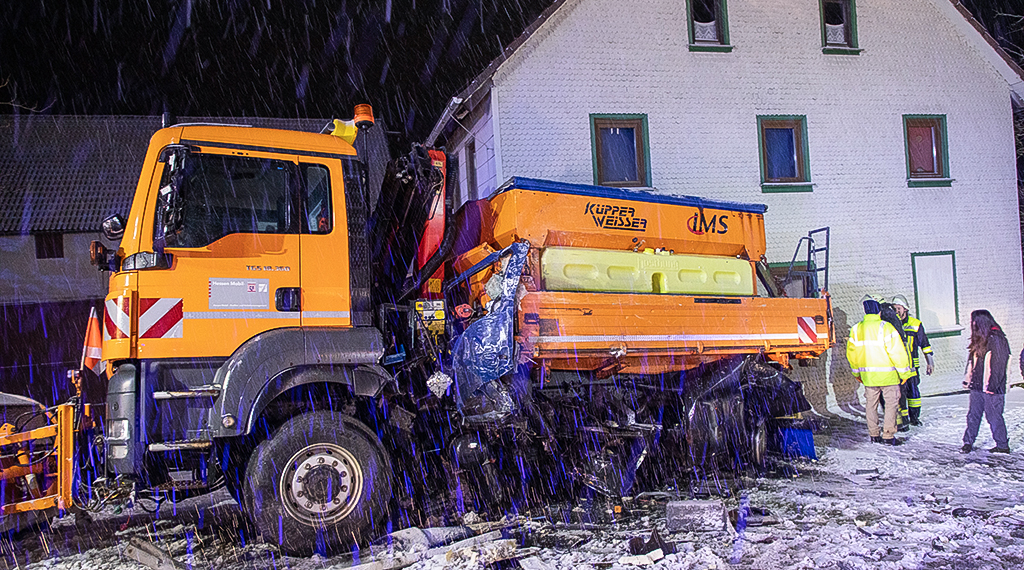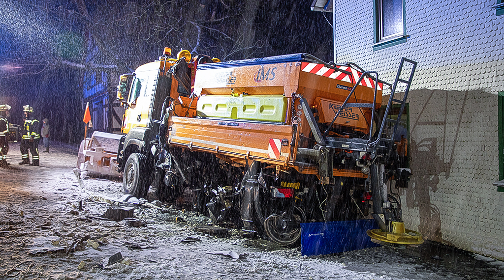 Räumfahrzeug kollidiert auf verschneiter Straße mit Lkw und rutscht gegen Wohnhaus