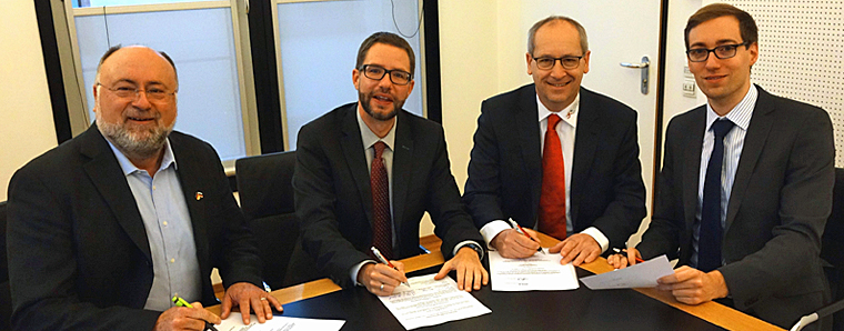 Nach ausführlichen Gesprächen haben (von links) Jugenddezernent Matthias Zach, Landrat Thorsten Stolz sowie Stefan Bahn und Florian Dinges für den Sportkreis Main-Kinzig die wichtige Vereinbarung unterzeichnet.