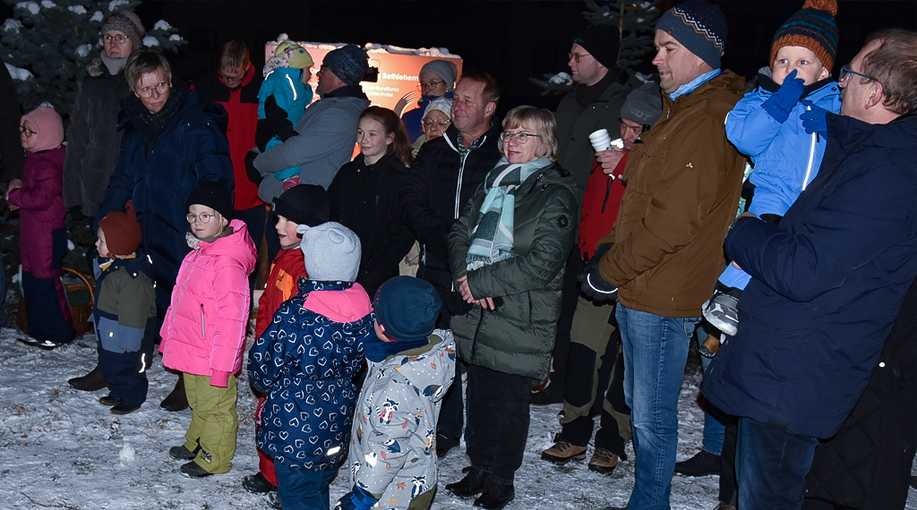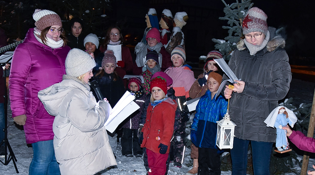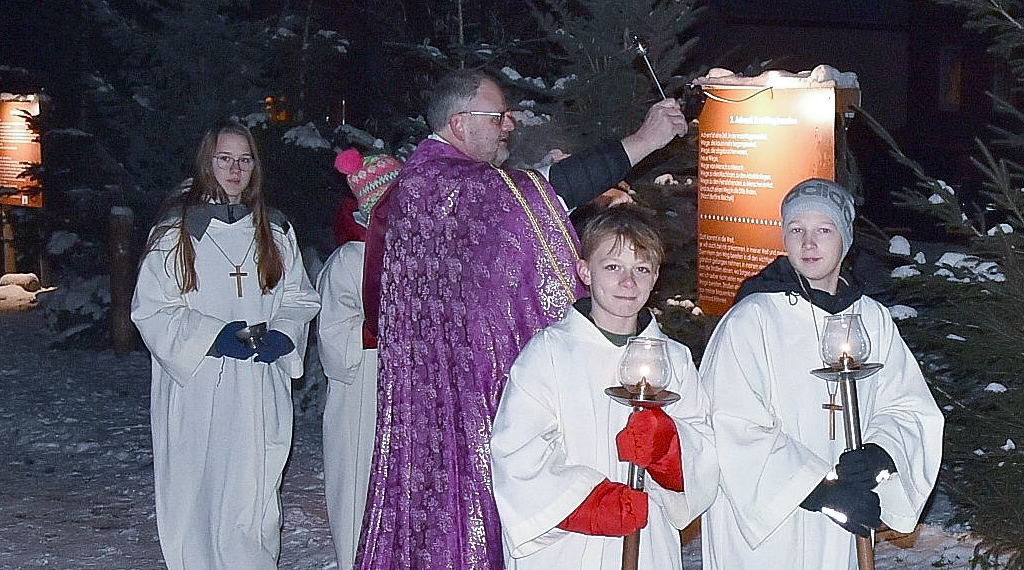 Initiator Theo Lenz begrüßte Pfarrer Ulrich Piesche, Bürgermeister Jürgen Hahn sowie den Kindersingkreis (Leitung Stephanie Hardegen, Jacqueline Mathes). Er dankte der Gemeinde für die Bereitstellung des Platzes und Material für den Wegebau, damit man trockenen Fußes die 10 Tafel und insgesamt 14 Stationen besuchen könne, so der Initiator. Neu sei, dass jede Tafel mit einem QR-Code versehen sei auf dem zusätzlich meditative Text und Musik hinterlegt seien. Mit den Liedern „Macht die Tür auf und Eins, zwei, drei, vier Weihnachten steht vor der Tür“ stimmte der Kindersingkreis auf die Segnung des Adventsweges ein. Nach einem meditativen Text zum Advent, gelesen von Nadine Lenz und dem Segensgebet von Pfarrer Ulrich Piesche ging dieser mit den Messdienerinnen und Messdiener entlang der einzelnen Stationen und Figurengruppen und segnete diese mit Weihrauch und Weihwasser. Natürlich durfte das gemeinsam gesprochene „Vater unser“ nicht fehlen.