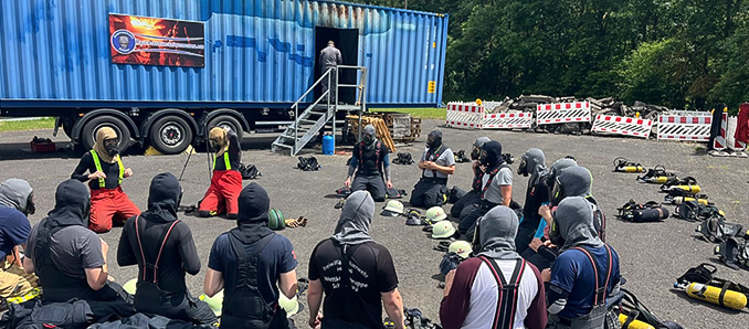 In der Rauchgasdurchzündungsanlage konnten pro Durchgang 16 Einsatzkräfte gleichzeitig an der praktischen Übung teilnehmen. Diese begann mit einer Kurzeinweisung in die Atemschutzgeräte und der Erläuterung zur Vorgehensweise im aufgestellten Übungscontainer mit anschließendem Hohlstrahlrohrtraining.