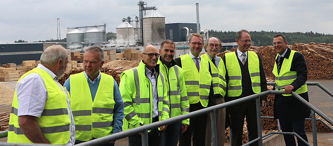 Holzstapel soweit das Auge reicht… Rund 50.000 Festmeter Holz lagern auf dem Gelände der Pfeifer Group in Wallenrod - in nur zehn Produktionstagen wäre das alles verarbeitet. Firmenchef Michael Pfeifer, Regierungspräsident Dr. Christoph Ullrich, Bürgermeister Rainer-Hans Vollmöller, Wirtschaftsdezernent Dr. Jens Mischak, Werksleiter Andreas Schmid, Geschäftsführer Gernot Hormess, Lothar Pietsch (Erster Stadtrat Lauterbach) und Willy Krenzer (Stadt Schlitz) beim Rundgang über das Betriebsgelände. (v.r.) Foto: Gaby Richter
