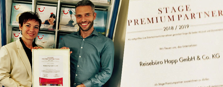 Freuen sich über die Auszeichnung. Hier die Mitarbeiter Nicole Francois und Patrick Binder vom Reisebüro Happ in Flieden