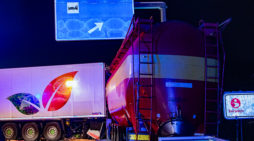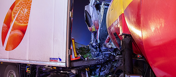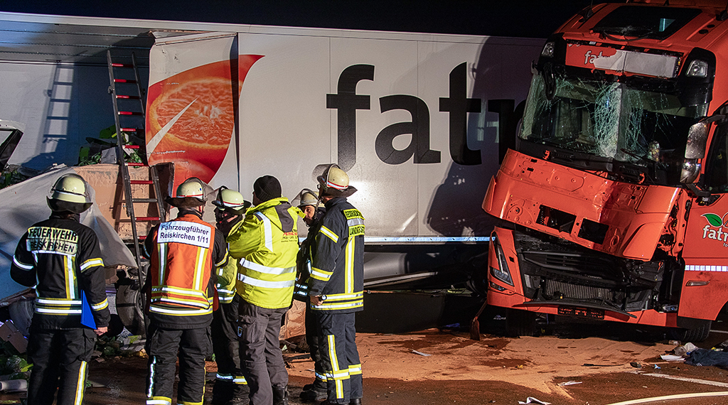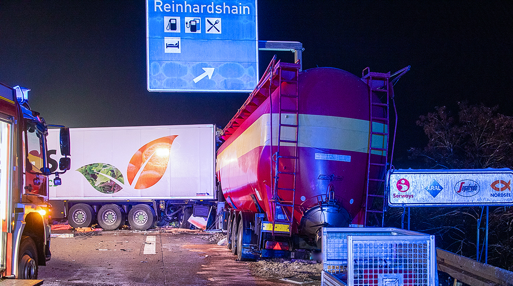 In der Nacht passierte dann das, was viele befürchtet hatten. Während vorne noch alles im Schnee stand, war hinten die Straße frei, sodass der Verkehr normal fließen konnte. Ein Lkw-Fahrer übersah bei Reiskirchen, kurz vor der Raststätte Reinhardshain, eben dieses Stauende. Sein Silozug raste ungebremst in die wartende Fahrzeugschlange und schob seinen Vordermann auf den davor stehenden Lkw. Durch die Wucht des Aufpralls wurde die Fahrerkabine des Verursachers bis zur Unkenntlichkeit zerstört, der Mann in seinem Führerhaus eingeklemmt. Rettungskräfte waren schnell zur Stelle und mussten zunächst einmal ein Feuer löschen, dass am verunfallten Laster ausbrach. Als der Notarzt den Fahrer untersuchen konnte, war schnell klar, dass für ihn jede Hilfe zu spät kommt. Er war vermutlich sofort tot.