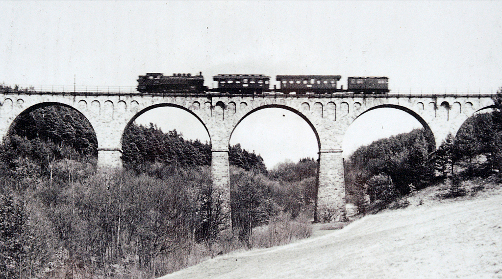 Wer von der B27 bei Burghaun in Richtung Steinbach abbiegt, den zweiten Weg rechts durch den Wald in Richtung des Weilers Klausmarbach befährt, dem tut sich ein imposantes Bauwerk auf. Dabei handelt es sich um die alte und größte Eisenbahnbrücke der ehemaligen Bahnstrecke Hünfeld-Wenigentaft. Im deutschen Eisenbahnverkehr erlangte sie einst große Bedeutung. Infolge dieses Streckenneubaus wurde sie 1906 eingeweiht und vor genau 70 Jahren, im Jahre 1938, erweitert. Der von Pfeilern getragene mächtige Viadukt mit seinen sechs Bögen ist eine „imposante und erhaltenswerte Bauleistung und Ingenieurkunst“. Die 130 Meter lange Brücke überspannt eine Talhöhe von 32 Metern. Entsprechend damaliger Bautechnik wurde sie aus reinem Sandstein errichtet. Ihre Bögen mussten sowohl ihr Eigengewicht als auch die Last der darüber fahrenden Züge tragen.