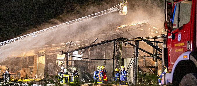 Am Montagabend, um 22.30 Uhr, ging die Mitteilung über den Brand in dem Aussiedlerhof bei der Integrierten Leitstelle von Feuerwehr und Rettungsdienst ein. Ein Großaufgebot von Feuerwehr und Polizei begab sich umgehend zu der Brandörtlichkeit. Bereits bei Anfahrt der Einsatzkräfte waren die Flammen ersichtlich, die meterhoch aus der Halle schlugen, in der sich zu dieser Zeit rund 100 Rinder und Kälber befanden.