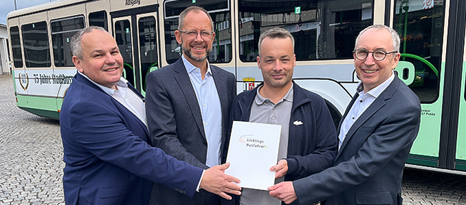 Bei der Übergabe der Urkunde gratulierten RhönEnergie-Geschäftsführer Dr. Arnt Meyer, Geschäftsführer Thomas Lang sowie Prokurist Michael Schneider. „Unsere Busfahrer leisten täglich Großes: Sie steuern nicht nur sicher und pünktlich durch den Verkehr, sondern tragen Verantwortung für jeden Fahrgast“, betonte Meyer. Die Ehrung sei daher ein wichtiges Signal der Wertschätzung.