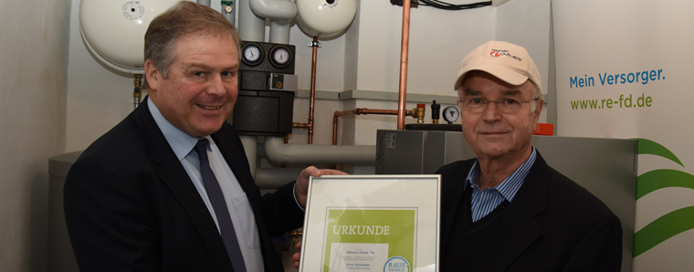 Vertriebsleiter Klaus Moll (links) überreicht Erich Schneider die Urkunde für den ältesten Heizkessel, der während der Raustauschwochen 2017 getauscht wurde.