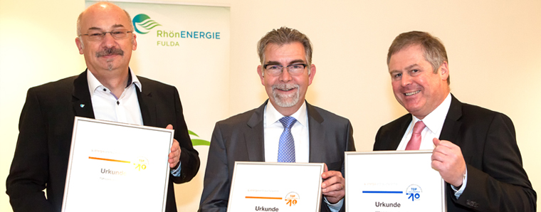 Freuen sich über die erneute Auszeichnung für die RhönEnergie Fulda im lokalen Versorgungsgebiet (v. l.): Christoph Hau, Abteilungsleiter des Privatkundenvertriebs, Martin Heun, Sprecher der Geschäftsführung und Vertriebsleiter Klaus Moll. Foto: RE-Fulda