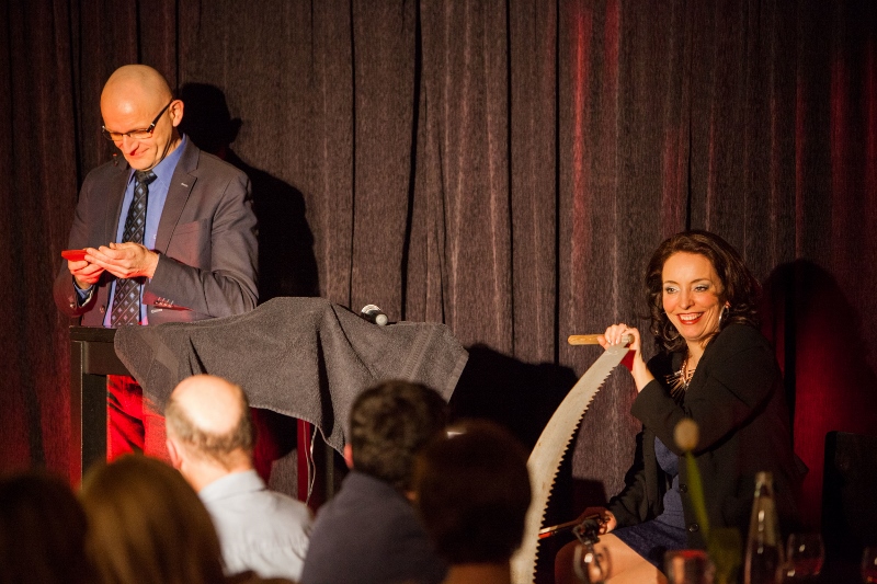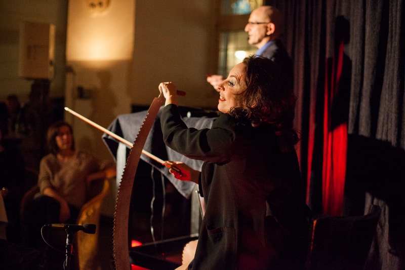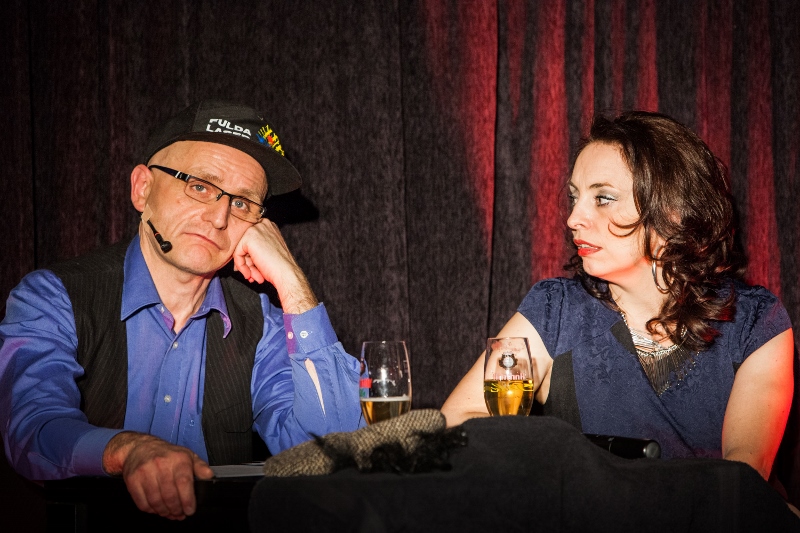 Überhaupt Verarbeitung: Richard Müller ist ein gelungenes Beispiel für das souveräne Spiel mit literarischen Formen. Prosatexte, Gedichte, Dialoge, alle diese Textarten findet man in seinem Repertoire. Sogar Haikus hat er geschrieben, herrlich bedeutungsschwer von Michael Bleuel vorgetragen und von Marianne Blum an der singenden Säge untermalt, einem „Original Rhöner japanischen Meditationsinstrument“, wie sie selbst sagte. Michael Bleuel dazu: „Frau Blum an der Nervensäge. Endlich hat sie ihr Instrument gefunden.“ Mit anderen Worten: die beiden verstanden sich prächtig und ergänzten sich auf der Bühne. Kein Wunder, kennen sie sich doch schon so viele Jahre und haben schon so manche tolle Show zusammen gemacht. Und dass Michael Bleuel prädestiniert für eine solche Lesung, steht außer Frage. Die Pointen brachte er gekonnt und mit viel Einfühlungsvermögen. Dazu seine unnachahmliche Mimik und darstellerischen Fähigkeiten – zum Schreien!