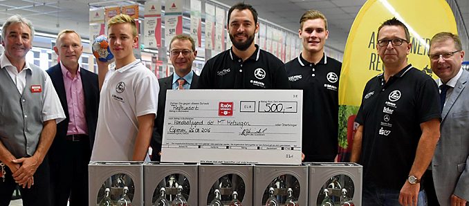 Melsungen. Sammeln für den Handballnachwuchs: Letzten Freitag übergab der MineralBrunnen RhönSprudel einer Delegation der MT Melsungen im REWE Markt Espenau einen Scheck in Höhe von 500 Euro zur Unterstützung der Jugendarbeit des Handball-Bundesligisten. Das Geld sammelte der MineralBrunnen aus dem Biosphärenreservat zusammen mit der REWE Region Mitte bei einer gemeinsamen Aktion: Von jeder verkauften Kiste RhönSprudel 6 x 1,0 Liter gingen vom 30.05. bis 04.06.2016 50 Cent an die Handballjugend der MT Melsungen.