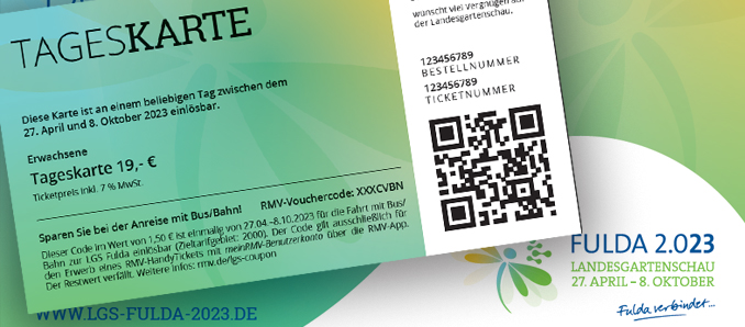 Hunderttausende Gäste werden zur Landesgartenschau 2023 in Fulda erwartet. Damit so viele Menschen wie möglich mit Bus und Bahn anreisen, haben der Rhein-Main-Verkehrsverbund und die Landesgartenschau (LGS) Fulda 2.023 sich etwas Besonderes einfallen lassen. Mit jeder gekauften Eintrittskarte erhalten die Besucherinnen und Besucher einen individuellen Rabattcode über 1,50 Euro für die Nutzung des öffentlichen Nahverkehrs am Tag des Landesgartenschau-Besuchs. Den Code gibt es für alle LGS-Tagestickets ab dem Verkaufsstart am 25. November dieses Jahres. Eingelöst werden können die Codes ab der Öffnung der Landesgartenschau am 27. April 2023 in der App RMVgo.