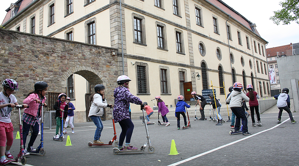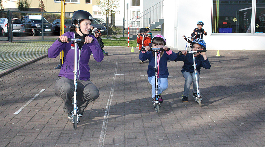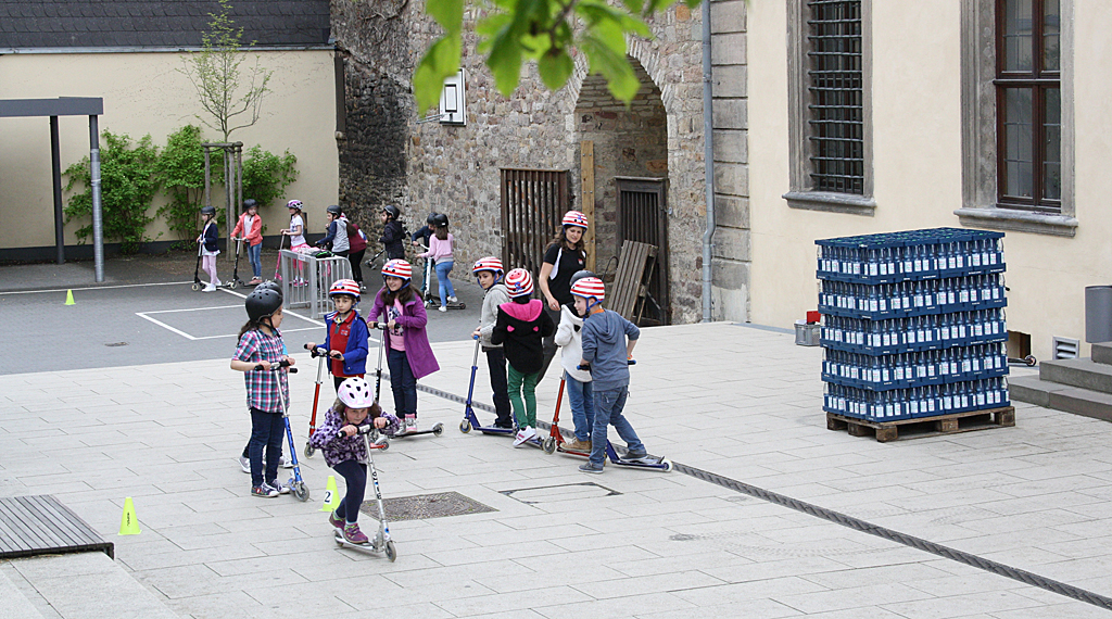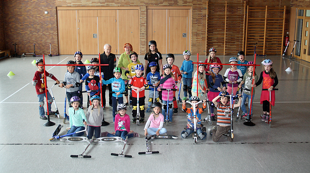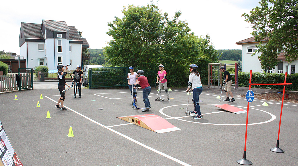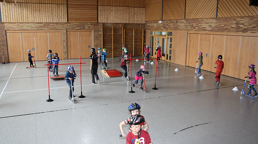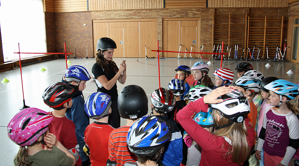 Station gemacht wurde an den Grundschulen in Kalbach, Fulda (Dalbergschule), Mackenzell, Marbach, Burghaun und Müs. Gefüllt mit unterschiedlichsten Rollern, Waveboards, Heelys, Schutzausrüstung und Helmen sowie zahlreichen Übungsmaterialien und Parcours-Equipment stand das RollerKIDS-Mobil für jeweils eine Woche zur Verfügung. „Wir starten am ersten Tag mit einem Schülerworkshop. Eine unserer Trainerinnen von CITYSKATE zeigt dann, dass man mit dem Roller nicht nur von A nach B fahren kann. Mit vielen Übungen und Spielen trainierten die Kinder ihr Gleichgewicht sowie ihre Koordination“, führt Madeleine Arndt aus. Verkehrssicherheit ist natürlich auch Teil des Workshops: Von „Wie sitzt der Helm richtig?“ über das „Richtige Bremsen“ bis hin zu „Wo darf ich fahren“. Danach dürfen die Kinder sich frei bewegen und alle weiteren, tollen Sportgeräte aus dem RollerKIDS-Mobil ausprobieren.