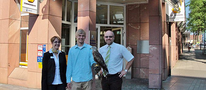 Mit seinem Mentor Martin Kremer, stellvertretender Leiter der Hessischen Verwaltungsstelle des UNESCO-Biosphärenreservats und Geschäftsführer des Vereins Natur- und Lebensraum Rhön, Bastian Sauer, Leiter des Artenhilfsprojektes Rotmilan im Biosphärenreservat und Michael Schanze von der Jagd- und Erlebnisfalknerei kam Gräf jetzt in die Commerzbank Filiale nach Fulda, um dort zum Abschluss seines Praktikums ein lebendiges Beispiel seines Studienobjektes vorzustellen. Elke Schäfer, als Filialdirektorin für die seit vielen Jahren angebotenen Praktika auf der Wasserkuppe zuständig, begegnet der gefiederten Besucherin namens „Lucia“ mit Respekt: „Die Spannweite der Flügel ist mit anderthalb Metern doch sehr beeindruckend. Und ich freue mich über die gute Verbindung zu unseren Praktikanten und dem Biosphärenreservat. Als jemand, der selbst sehr naturverbunden ist, stehe ich voll hinter dem Praktikumskonzept. Wir fördern die Teilnehmer, aber fordern sie auch. Dass es den Praktikanten auf ihrem weiteren beruflichen Weg von Nutzen ist, beweisen die positiven Erfahrungen aus den zurückliegenden 25 Jahren“, unterstreicht die Bankerin.