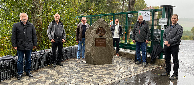 Das FCN-Phonolith- und Betonwerk Rupsroth beheimatet künftig den Franz-Carl-Nüdling-Platz: Anlässlich einer kleinen Feierstunde wurde dazu im Beisein von Hilders‘ Bürgermeister Hubert Blum und Claus Breitung, Ortsvorsteher von Rupsroth, ein Phonolith-Findling enthüllt, in den ein Bronze-Relief des Unternehmensgründers Franz Carl Nüdling eingelassen wurde. Das Kunstwerk war in Zusammenarbeit mit Bildhauer Herbert Holzheimer entstanden. „Wir freuen uns, heute den kleinen Platz sowie die Zufahrtsstraße zu Ehren unseres Firmengründers offiziell auf den Namen Franz-Carl-Nüdling-Platz zu taufen.