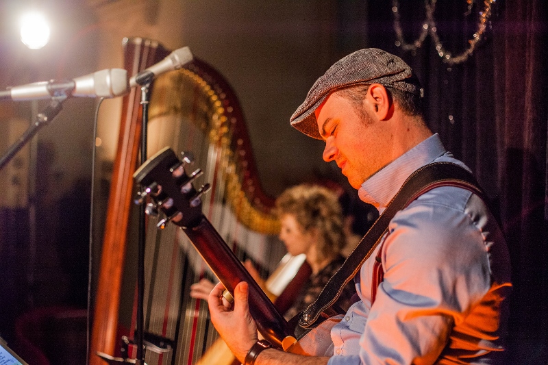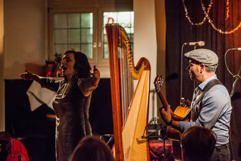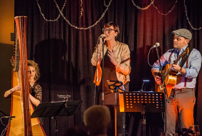 Das war sie auch bei dieser Ausgabe am 21.12., die alles bot, was man sich zur Weihnachtszeit nur wünschen kann: Verzaubernde Harfenklänge, samtweichen Gesang, nachdenkliche Texte, aber auch lustige Geschichten und beschwingte Rhythmen. Verantwortlich für das musikalische Grundgerüst waren: Anne Kox-Schindelin an der Konzertharfe und Stephan Schmitt an der Gitarre. Die beiden exzellenten Instrumentalisten bildeten das solide Fundament, über das sich die Sängerin Conny Morath erheben konnte, um das Publikum mit ihrer „Karamell-Stimme“ zu verführen und ins Schwelgen zu bringen. Dabei hatten die drei Profi-Musiker aus dem Würzburger Raum beileibe nicht nur Weihnachts-Klassiker wie „Winter Wonderland“ oder bekannte Gospels wie „Go, tell it on the mountain“ ausgewählt. Pop-Perlen wie „Imagine“, „Dance me to the end of love“ von dem kürzlich verstorbenen Leonard Cohen oder der österreichische Pop-Schlager „Irgendwann bleib i dann dort“ ergänzten das Repertoire und wirkten bei aller thematischen Ferne durchaus weihnachtlich-besinnlich. Das Tolle war aber vor allem: So wie der „Famose Saitenzauber“ die Musik darbot, klangen alle Stücke authentisch und wie für das Trio geschrieben. Das galt sogar für einen Ländler, der zunächst ganz im Stubenmusik-Stil von der Harfe begonnen wurde und dann von der Slide-Guitar mit einem Schuss wilder Westen versehen wurde.
