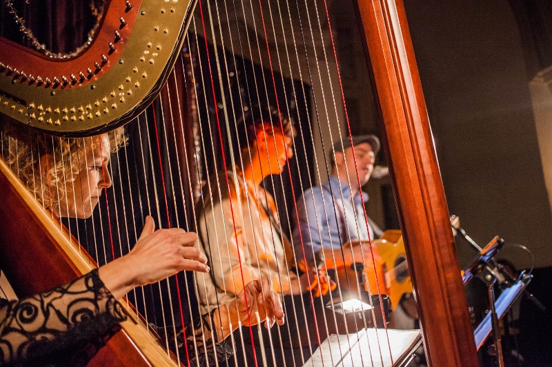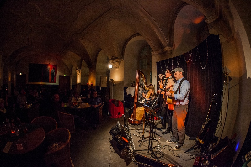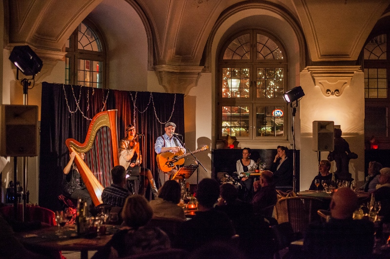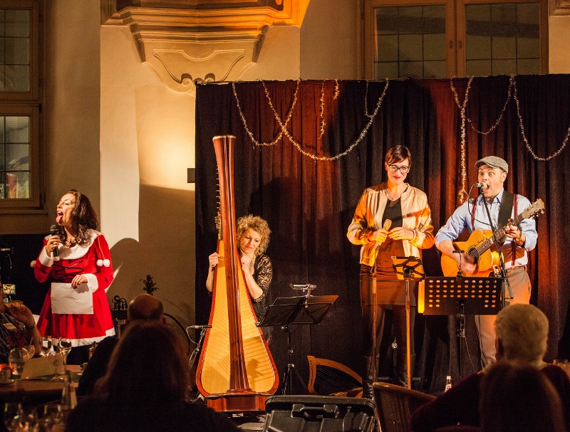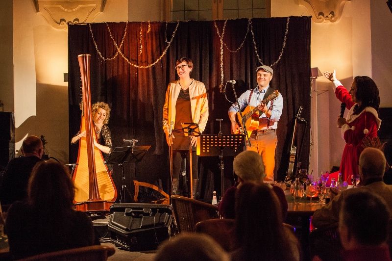 Originalgetreu wurde es, als die Harfenistin im letzten Set die Filmmusik von „3 Nüsse für Aschenbrödel“ anstimmte. Man meinte förmlich ein seliges Seufzen an den Zuschauertischen zu hören. Nach dieser nostalgischen Einstimmung wurde es jedoch nochmal richtig lustig mit dem interaktiven Hörspiel „3 Nüsse für Hermann“. An die 15 Zuschauer bekamen dabei Sprech- und Geräusch-Rollen wie „Handy-Klingeln“ oder „defekte Heizung“ und der ganze Saal machte mit als „Wind“ oder „Wolfsrudel“. Ein großer Spaß, dem das Trio „Famoser Saitenzauber“ schließlich noch einen musikalischen Höhepunkt mit dem gemeinsam mit Marianne Blum performten „Schlaflied“ von Max Raabe hinzufügte. Das kam so gut an, dass sich die Künstler erst nach 2 Zugaben in den vorweihnachtlichen Feierabend verabschieden konnten. Das Publikum verließ das Museumscafé beseelt, nicht ohne die weihnachtliche Hoffnung, beim Gernsehen bald wieder mit solch schönen Klängen verwöhnt zu werden. +++ (pm)