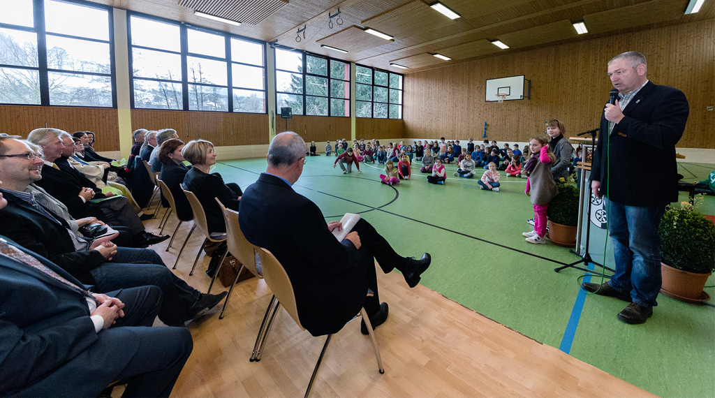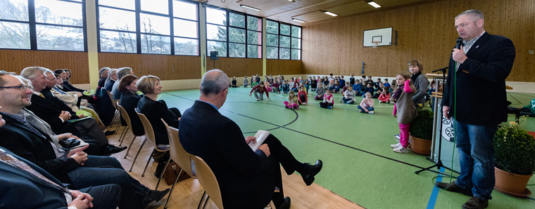Die großzügige Zuwendung des Landkreises Fulda sei wohl überlegt, so Landrat Bernd Woide in seinem Grußwort: Verantwortung für den ländlichen Raum zu übernehmen, zahle sich aus, in Poppenhausen sei der Sport Bindeglied und trage zur Erhöhung der Lebensqualität bei. Die Schule sei ein Ort, an dem sich Kinder vielfältig betätigen und entfalten könnten. Wer in der Kindheit Sport treibe, profitiere davon sein Leben lang, erklärte Poppenhausens Bürgermeis-ter Manfred Helfrich. Er sei froh, dass man in Poppenhausen die Schule im Dorf gelassen habe. Stephan Schmitt, stellvertretender Leiter des Staatlichen Schulamts in Fulda, beglückwünschte zudem zum 60-jährigen Jubiläum der Grundschule: Am 15. August 1955 sei das Schulgebäude der damaligen Volksschule eingeweiht worden, 253 Kinder hätten in fünf Klassen unterrichtet werden müssen, heute seien es auch fünf Klassen, aber 93 Kinder.