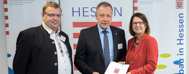 Bad Hersfelds Erster Stadtrat Gunter Grimm (M.) erhält zusammen mit Fachbereichsleiter Johannes van Horrick den Förderbescheid aus den Händen der Hessischen Stadtentwicklungsministerin Priska Hinz.