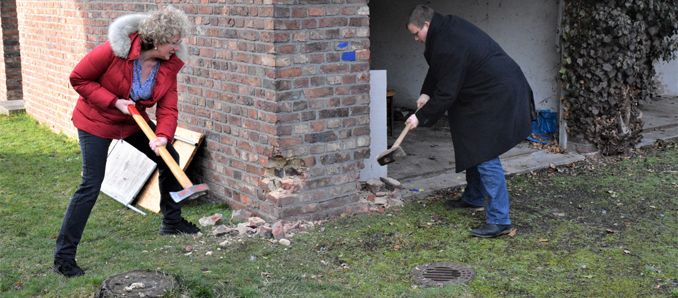 Jetzt geht es endlich los mit dem Anbau an das Vereinshaus in Sargenzell: Dort soll ein barrierefrei erreichbarer Gemeinschaftsraum anstelle des alten Toilettenhauses angebaut werden, der mit dem bestehenden Gebäude verbunden wird. Bürgermeister Benjamin Tschesnok und Ortsvorsteherin Pia Biedenbach sorgten mit gezielten Hammerschlägen für den Auftakt des Bauvorhabens. Da zunächst die beiden alten Garagen mit Sanitärbereich abgebrochen werden müssen, wurde zum Hammer statt Spaten gegriffen, um schon mal symbolisch mit dem Abbruch des Altgebäudes zu beginnen.