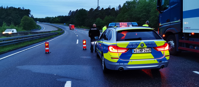 Am Dienstagmorgen kam es auf der A7 Fulda-Kassel Gemarkung Niederaula zu einem Verkehrsunfall. Ein 50-jähriger ukrainischer Sattelzugfahrer aus Polen befuhr die A7 in nördlicher Fahrtrichtung. Nach derzeitigen Ermittlungen kam der Fahrer mit seinem Sattelzug zwischen dem Hattenbacher Dreieck und dem Kirchheimer Dreieck vermutlich aufgrund nicht angepasster Geschwindigkeit auf regennasser Fahrbahn nach links von der Fahrbahn ab. Der Fahrer konnte den Sattelzug nicht mehr rechtzeitig zum Stillstand bringen und stieß gegen die angrenzende Betongleitschutzwand. Durch den Anprall und das ruckartige Gegenlenken des Fahrers riss die Plane des Sattelaufliegers auf und ein Großteil der 25 Tonnen Ladung, verschiedene Weinsorten in Kisten und auf Paletten verpackt, fielen auf die Fahrbahn und zerbrachen. Der Fahrer des Sattelzuges blieb durch das Unfallgeschehen unverletzt. Weitere Fahrzeuge waren an dem Unfall nicht beteiligt. Der entstandene Sachschaden wird auf etwa 75.000 Euro geschätzt. Derzeit sind alle Fahrstreifen in Fahrtrichtung Kassel wegen des unfallbeschädigten Sattelzuges und der zerbrochenen (Weinflaschen-) Ladung auf der Fahrbahn gesperrt. Der nachfolgende Verkehr wird über den Standstreifen an der Unfallstelle vorbeigeleitet. Eine Rundfunkwarnmeldung wurde veranlasst. Der Verkehr staute sich an der Unfallstelle. Aufgrund Bergungs- und Reinigungsmaßnahmen wird es im Laufe des Vormittags zu weiteren Behinderungen in Fahrtrichtung Kassel kommen. +++