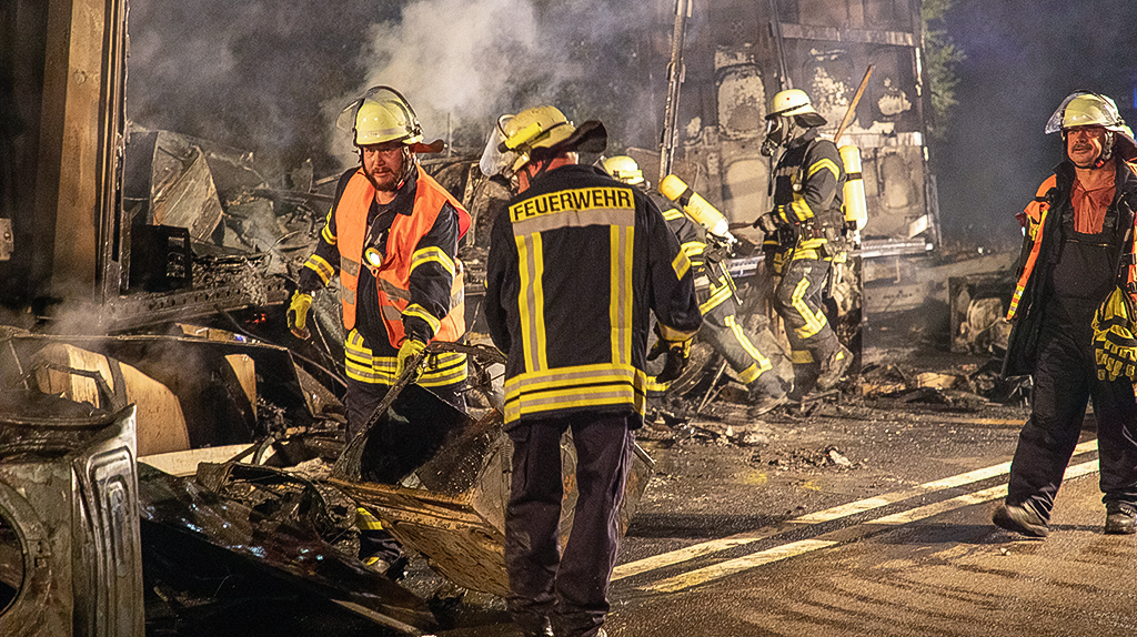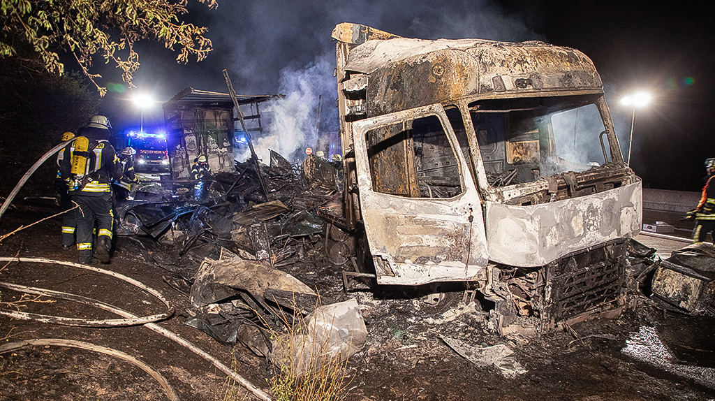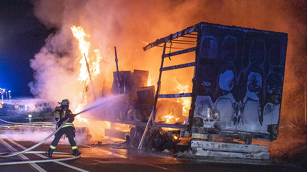 Ein 26-jähriger weißrussischer Lkw-Fahrer fuhr mit seinem Sattelzug voller Elektrogeräte am späten Abend von einem Rastplatz auf die A7 bei Hünfeld. Schon in der Ausfahrt vom Parkplatz bemerkte der Fahrer Flammen an seinem Fahrzeug. In letzter Sekunde schafft es der Mann, das Gespann auf dem Seitenstreifen abzustellen und den Notruf zu verständen. Als die Feuerwehr bereits kurze Zeit später eintraf, stand der Sattelzug in Vollbrand. Die Flammen hatten auf den Auflieger mit Waschmaschinen, Kühlschränken und anderen Großgeräten übergegriffen. Die Flammen schossen meterhoch in den Nachthimmel. Da sich der Fahrer bereits unverletzt in Sicherheit gebracht hatte, konnten sich die Feuerwehrleute auf die Brandbekämpfung konzentrieren. Da die Flammen zunächst drohten, auf die angrenzende Böschung überzugreifen, wurde eine aufwendige Wasserversorgung und Riegelstellung aufgebaut. Um auch alle Glutnester zu erreichen, musste der Auflieger entladen werden. In der ersten Phase des Einsatzes war die A7 in Fahrtrichtung Würzburg voll gesperrt. Im weiteren Verlauf konnte der Verkehr auf einer Spur an der Einsatzstelle vorbeigeführt werden. An dem Sattelzug entstand ein Totalschaden. Die Bergungsarbeiten und die damit verbundenen Einschränkungen für den Verkehr werden sich voraussichtlich bis in den Vormittag ziehen. Die Polizei hat die Ermittlungen zur Brandursache aufgenommen. +++