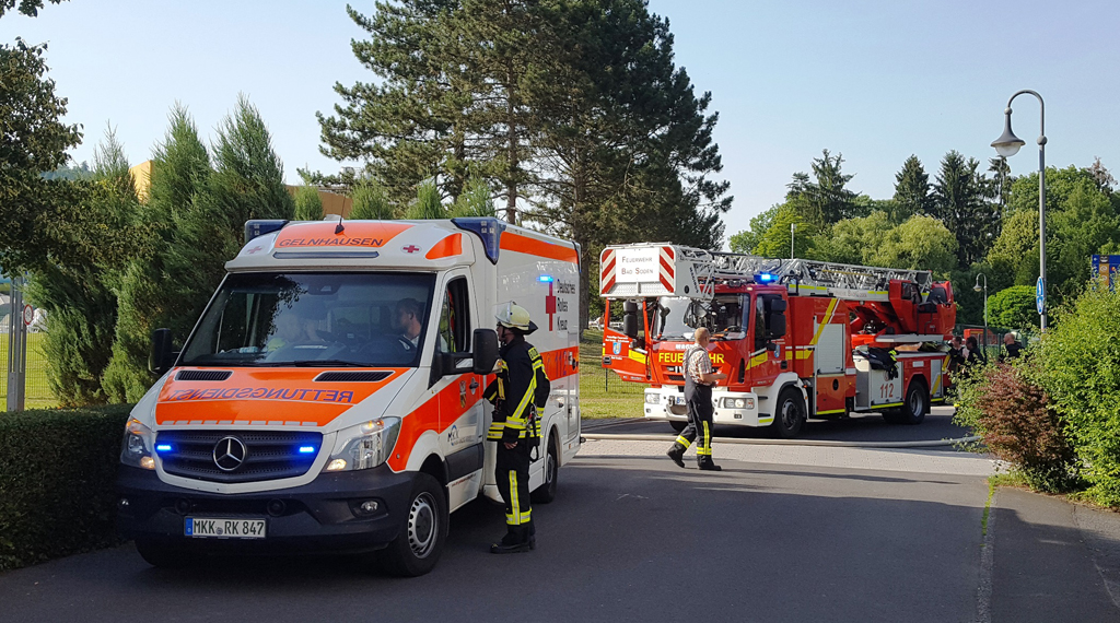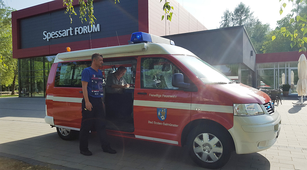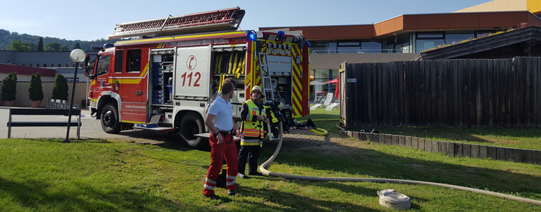 Bei Hochsommertemperaturen von 35 Grad Celsius wurde am späten Dienstagnachmittag die Feuerwehr Bad Soden-Salmünster alarmiert. Das Dach einer Außensauna, der Banja, in der Spessart-Therme in Bad Soden hatte Feuer gefangen. Die Schwimm- und Saunameister taten genau das Richtige: Sie ließen die Banja räumen, alarmierten die Feuerwehr und unternahmen u.a. mit einem Gartenschlauch erste Löschversuche, ohne sich selbst zu gefährden. Desweiteren meldete Kurdirektor Stefan Ziegler der Leitstelle die beste Anfahrt für die Feuerwehr über den Kurpark, was zusätzlich Zeit für die Erkundung sparte. Um 17:27 Uhr ging die Alarmierung ein; die Feuerwehren Bad Soden, Ahl und Huttengrund sowie der Rettungsdienst rückten an und übernahmen die weiteren Löscharbeiten.
