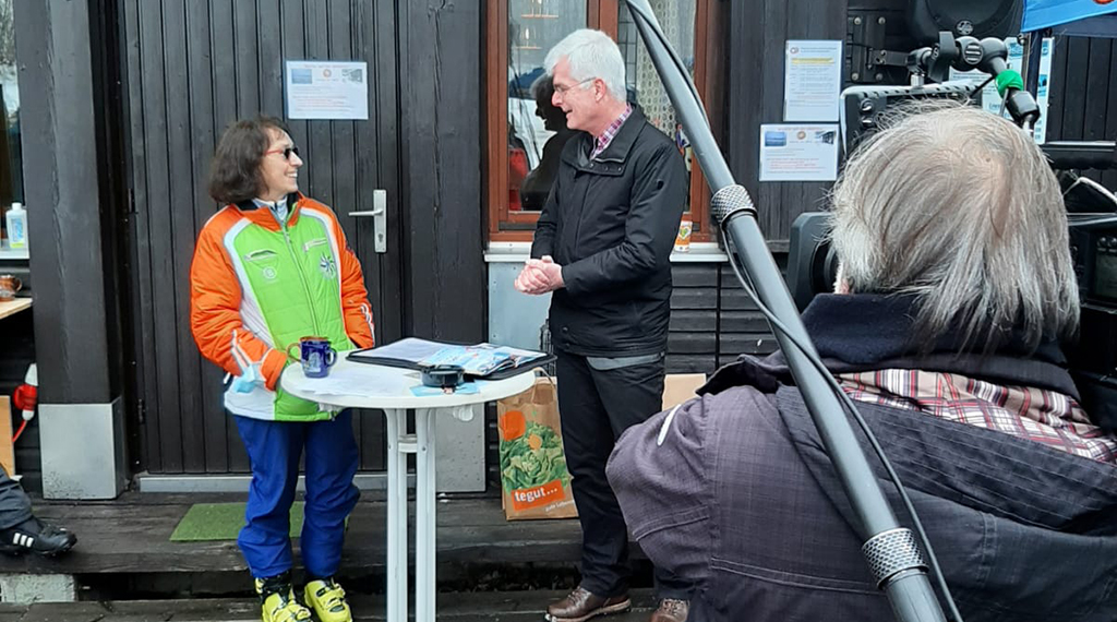 „Für uns als Skiclub ist es eine große Freude und Ehre eine der erfolgreichsten Behindertensportlerinnen weltweit zu würdigen und diese Skiwiese ab sofort in Reinhild-Möller-Abfahrt zu taufen. Damit wollen wir die einmaligen sportlichen Leistungen von Reinhild, die nicht nur für mich sondern für viele Kinder und Jugendliche ein großes Vorbild ist, für immer in ihrer Heimat in Erinnerung behalten, dort wo ihre Karriere ihren Anfang nahm!“ Mit diesen Worten der 1. Vorsitzenden Dorothee Schaar am Vormittag im Hessischen Rundfunk auf hr 3 wurde der besondere Tag für Reinhild und den SCN eröffnet. Nur wenig später konnte man Reinhild dann in einem Interview auf hr4 hören. Zu dieser Zeit stand aber schon ein Fernsehteam des Hessischen Rundfunks vor dem Anwesen von Mutter Hedwig in der Neuensteiner Straße, um ein Interview mit Reinhild über ihre außergewöhnliche Karriere aufzuzeichnen. Danach ging es mit dem Fernsehteam auf das Plateau des Eisenbergs, wo neben der Ehrenbank von Ehrenbürgermeister und Ehrenmitglied Walter Schmidt, einer der Förderer von Reinhild, nun die neue Ehrentafel in Erinnerung an die 19-fache Goldmedaillengewinnerin bei Paralympischen Winter- und Sommerspielen vom Verein aufgestellt wurde. Gestiftet wurde diese von Mitglied und Schreinermeister Stephan Kirsch aus Heenes. Mit gekonnten Schwüngen auf der noch vorhandenen Schneedecke kam dann Reinhild an der Skihütte an und die Veranstaltung konnte beginnen.