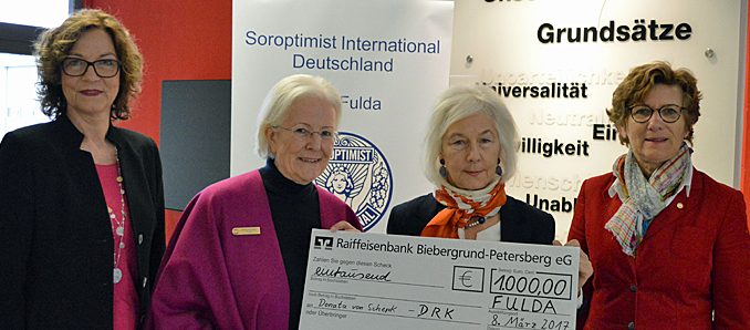 Fulda. Mit großer Freude nahm Donata Freifrau von Schenck zu Schweinsberg am Internationalen Frauentag einen Scheck der Soroptimistinnen in Höhe von 1.000 Euro entgegen. Die Vizepräsidentin des DRK hatte in ihrem Festvortrag bei der Jahresauftaktveranstaltung des SI Club Fulda im Marmorsaal des Stadtschlosses die Arbeit des Deutschen Roten Kreuzes vorgestellt und dabei neben der Arbeit im politischen Raum einen Schwerpunkt auf Projekte für und mit Frauen in den Herkunftsländern der Flüchtlinge gelegt. Besonders am Herzen lag ihr dabei ein Brunnenprojekt in Uganda, das sie erst kürzlich besucht hatte.