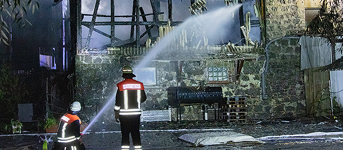 Zu einem Brand einer Scheune kam es am Freitagabend in der Lumdastraße in Mücke-Atzenhain (Vogelsbergkreis). Die Flammen sind auf ein Wohnhaus übergegriffen. Die Rettungsleitstelle des Vogelsbergkreises wurde in der Nacht von Freitag auf Samstag um kurz nach 22 Uhr, über einen größeren Brand in der Lumdastraße in Mücke-Atzenhain informiert. Vor Ort konnte durch die Einsatzkräfte eine Scheune in Vollbrand festgestellt werden, wobei die Flammen auch schon auf das benachbarte Wohnhaus übergriffen. Personen befanden sich nicht mehr in den Gebäuden. Durch die in der Spitze rund 150 Einsatzkräfte der Feuerwehr Mücke mit Unterstützung umliegender Einsatzabteilungen, konnten die Flammen soweit unter Kontrolle gebracht werden, dass vom Wohnhaus lediglich die Fassade und das Dach in Mitleidenschaft gezogen wurden. Die Scheune brannte jedoch komplett nieder, in der unter anderem zwei Fahrzeuge (Pkw und Traktor) standen, die ebenfalls erheblich beschädigt wurden. Nach derzeitigem Kenntnisstand wird der Gesamtsachschaden auf rund 250.000 Euro geschätzt. Aufgrund der Rauchgase wurde eine Warnmeldung für die Bevölkerung veranlasst. Neben drei Streifen der Polizeistation Alsfeld und Mittelhessen waren auch Beamte der Kriminalpolizei Osthessen eingebunden, die noch in der Nacht die Ermittlungen zur Brandursache aufnahmen. Aktuell kann noch nicht gesagt werden, was zu dem Brand führte, da noch weitere Ermittlungen ausstehen. +++ kec