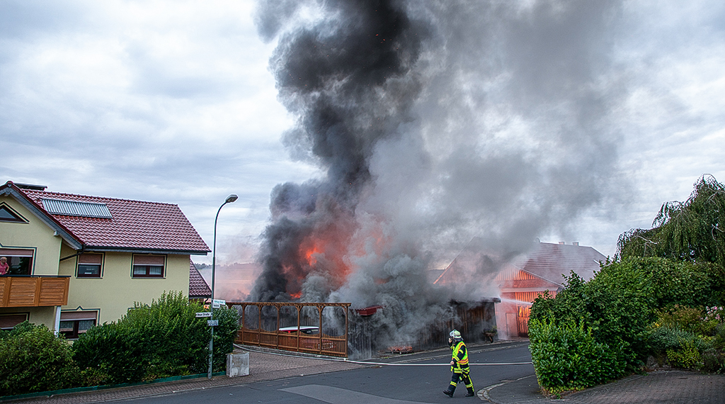Mitten in einem Wohngebiet stand am Dienstagabend eine als Werkstatt genutzte Scheune in Hainzell in Flammen. Das aus Holz bestehende Gebäude stand bereits beim Eintreffen der Feuerwehr in Vollbrand. Nach ersten Informationen soll es Explosionen gegeben haben wodurch sich die Flammen noch schneller ausgebreitet haben. Für die Feuerwehrleute galt es zunächst ein Übergreifen der Flammen auf angrenzende Wohnhäuser zu verhindern. Rund 120 Feuerwehrleute waren schon zu Beginn im Einsatz und starteten einen massiven Löschangriff. Trotz des schnellen Einsatzes konnte der Totalverlust der Scheune, samt der wertvollen Oldtimern, nicht verhindert werden. Die Löscharbeiten gestalteten sich durch den Einsturz der hölzernen Konstruktion als schwierig und dauern voraussichtlich noch bis in die frühen Morgenstunden an. Zur Brandursache kann derzeit noch nichts gesagt werden. Die Polizei hat die Ermittlungen aufgenommen. Der Sachschaden wird auf 250.000 Euro geschätzt. 3 Personen wurde mit einer Rauchvergiftung ins Krankenhaus eingeliefert. +++