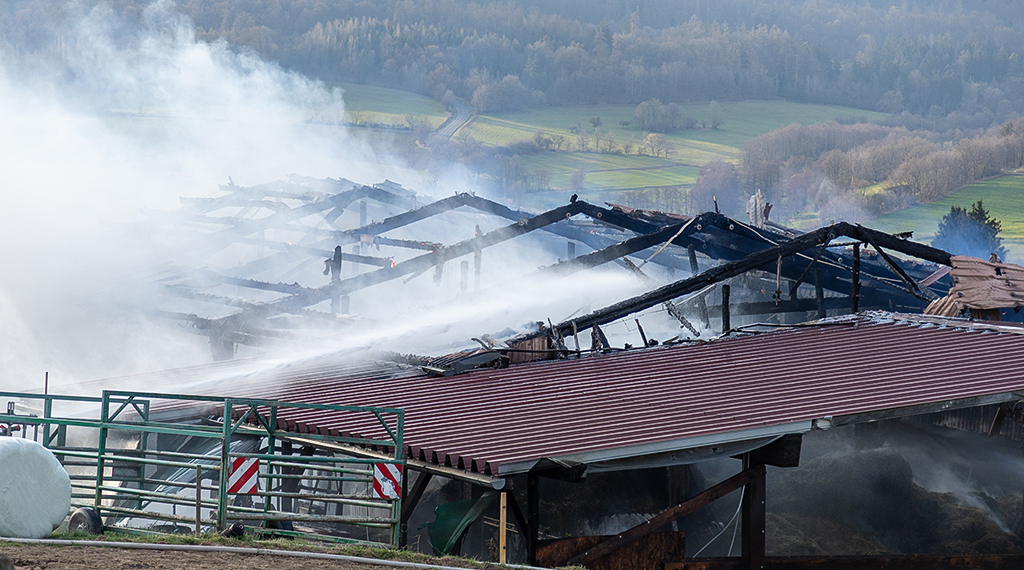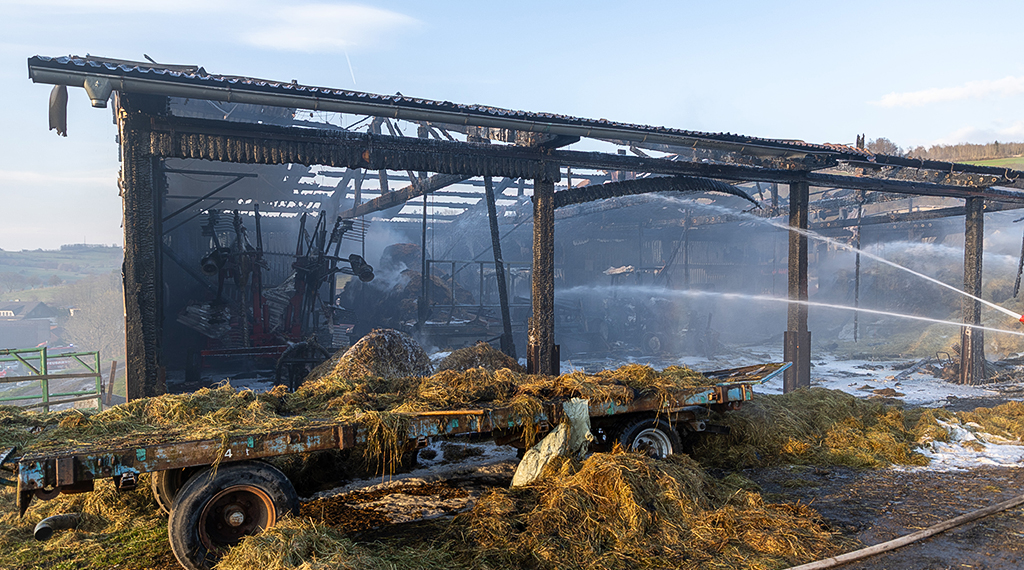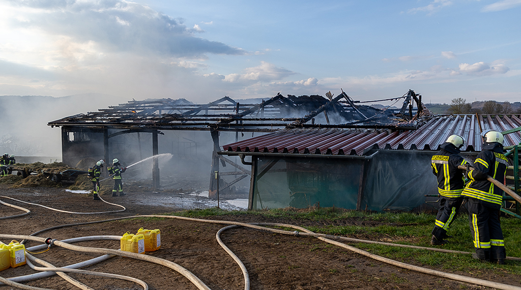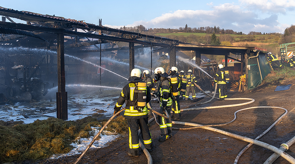 Dort war gegen 17 Uhr aus noch unklarer Ursache ein Feuer ausgebrochen, das sich kurze Zeit später auf die gesamte Halle ausgebreitet hatte, sodass diese in Vollbrand stand. Dabei wurden in der Halle abgestellte Fahrzeuge und Maschinen erheblich beschädigt sowie das Hallendach, auf dem sich eine Photovoltaikanlage befand, nahezu komplett zerstört. Die Flammen, die durch lebendigen Wind angefacht wurden, griffen zudem auf Dutzende eingelagerte Heuballen über, was letztlich für die massive Rauchentwicklung verantwortlich gewesen sein dürfte. Dahingehend wurden Anwohner und Verkehrsteilnehmer mittels Warnmeldung aufgerufen, Fenster und Türen geschlossen zu halten. Personen oder Tiere wurden nicht verletzt.